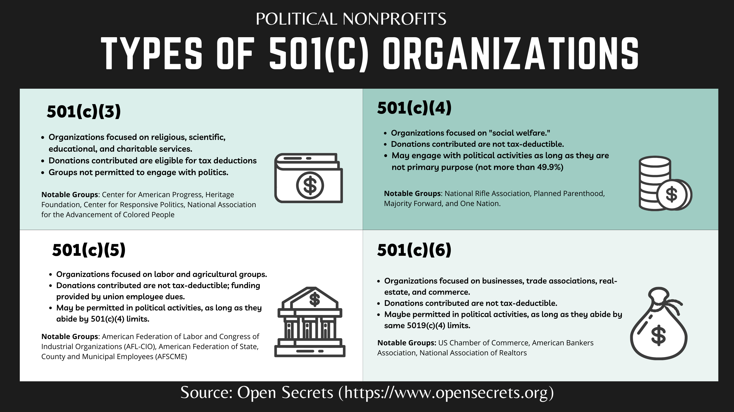 Some of the most prominent forms of dark money involve Political Action Committees (PACs) which are a 527 organization that works to raise and spend money during election