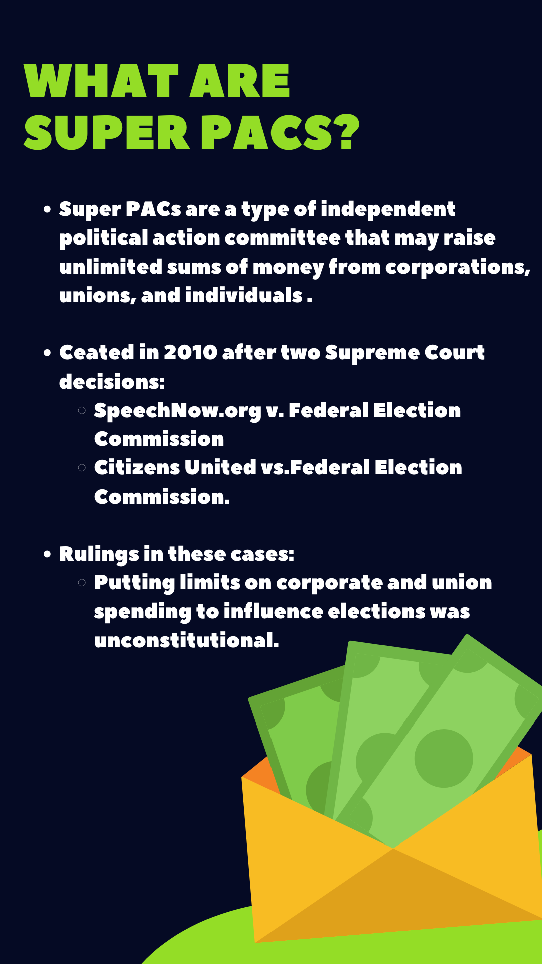 Independent expenditure-only committees, otherwise known as super PACs, were established in 2010 and allow for large sums of private money to be channeled