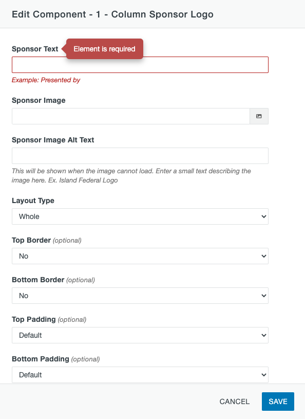 This component allows you to have a sponsor image accompanied by text, with several options for padding, borders, and margins (top/bottom)