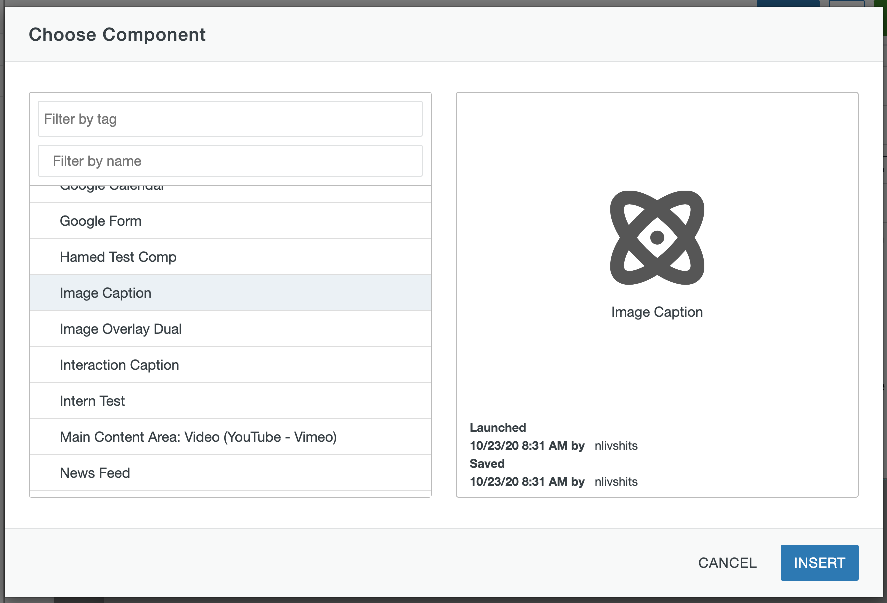 1) Click the "Insert Component" button as seen below, choose the "Image Caption" component and click the Insert button.
