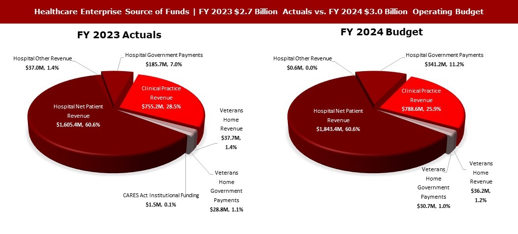 The FY 2024 funding budget is 11.1% (or $443.0M) more than the prior year (PY) actuals. $389.5M of this planned increase in funding is for the Healthcare Enterprise and $53.5M is for the Academic & Research Enterprise. The planned growth in the Healthcare Enterprise is primarily from patient revenue and the Medicaid Disproportionate Share Hospital program (DSH). For the Academic & Research Enterprise, the planned increase in funding is from self-generated IFR & SUTRA activities, state operating aid and SBF Support.