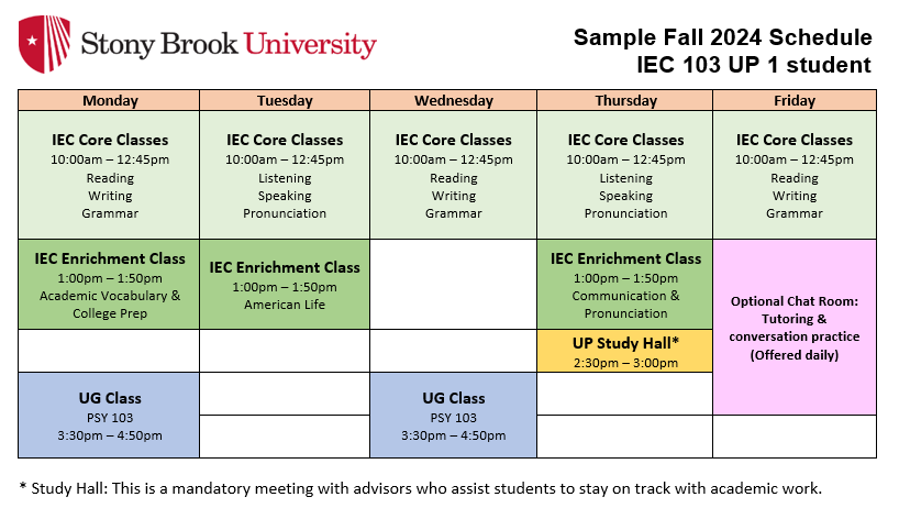 Click on the links below for examples of a weekly class schedule for an UP 1 or UP 2 student. Please note that undergraduate classes can be scheduled before or after IEC core classes.