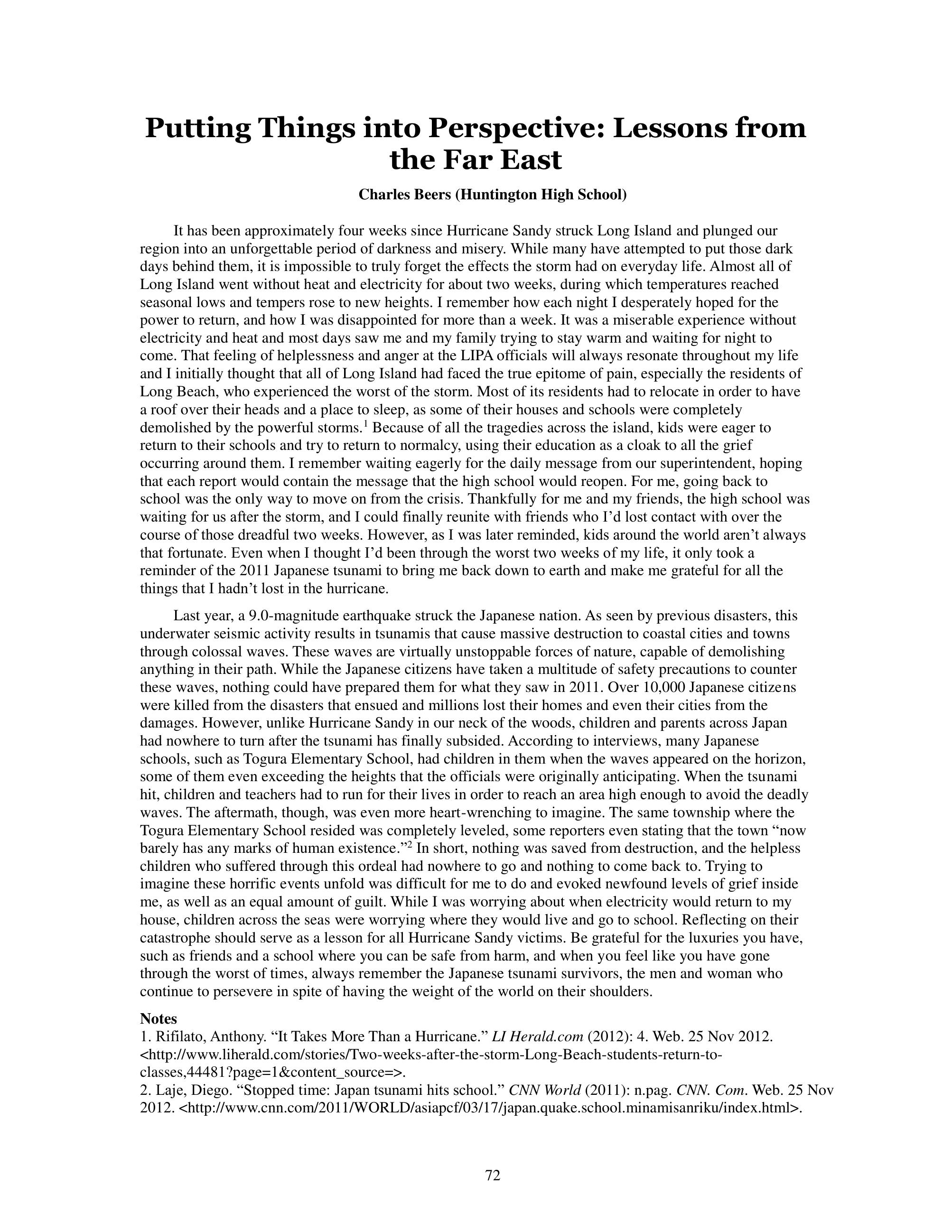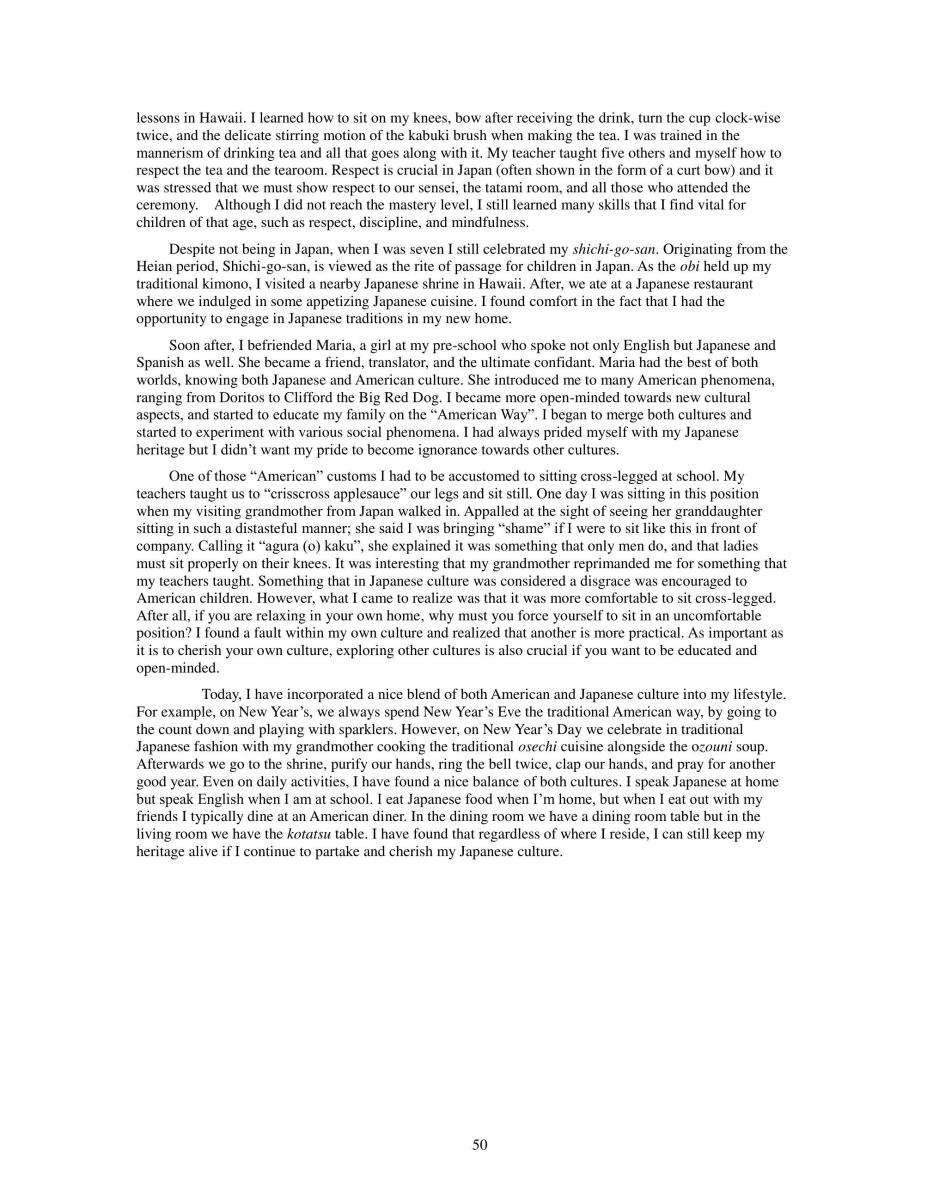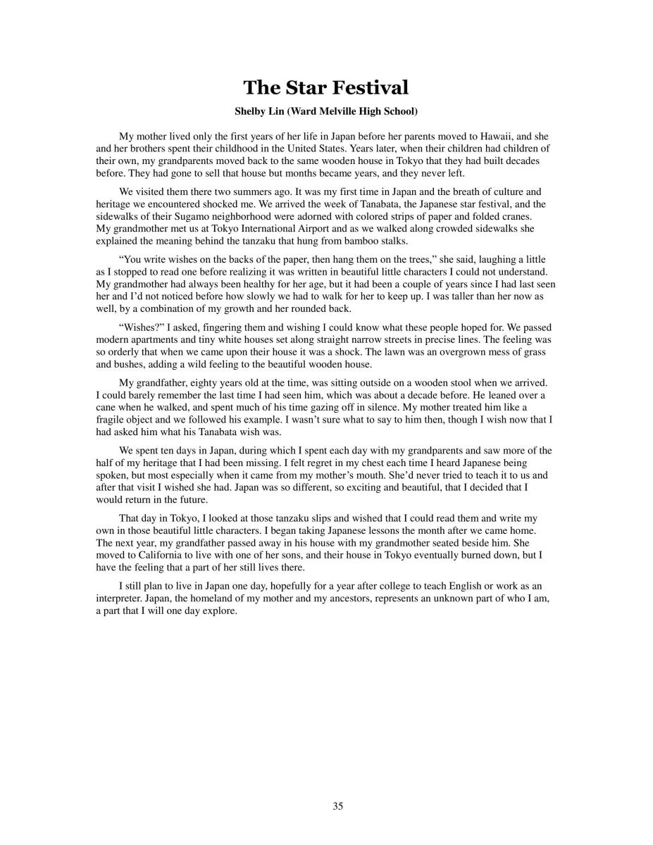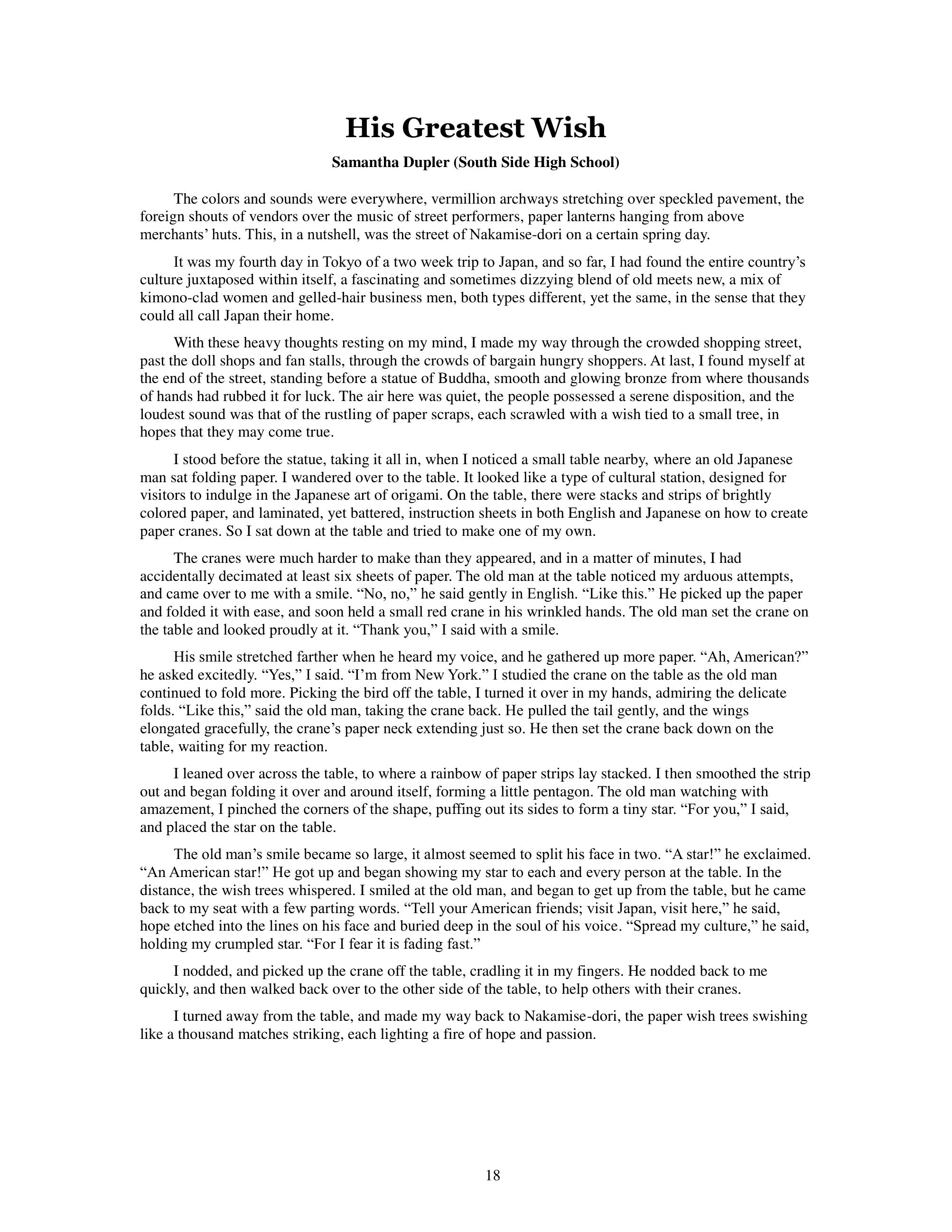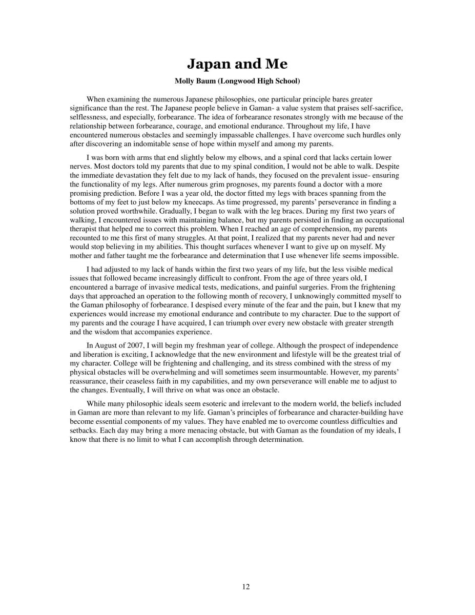 “Samurai in the Outfield”Colin Capece (Chaminade High School)My family is a baseball family. Baseball fascinates us. Baseball enthralls us. Baseball brings us together. Our family vacations are spent visiting ballparks and opening day is a cause for celebration. So it is no surprise that one of my family’s favorite summer pastimes is to tune in for the Little League World Series. Even though my three brothers and I are past our Little League baseball days, we still enjoy watching younger kids play in the annual tournament held in Williamsport, Pennsylvania. Year after year, we are mesmerized and our family conversation is dominated by the names and stories of the teams in that year’s competition.