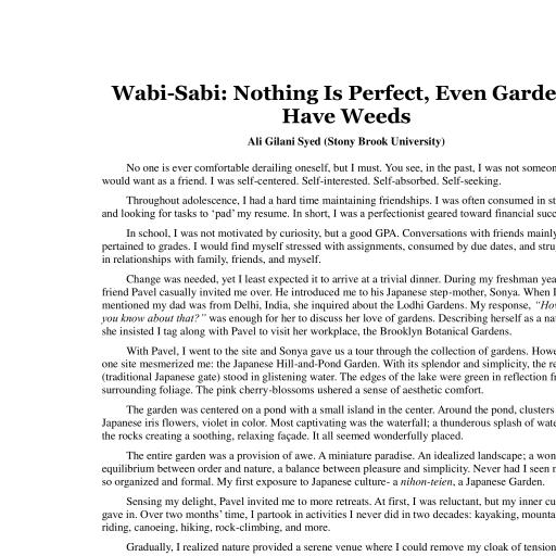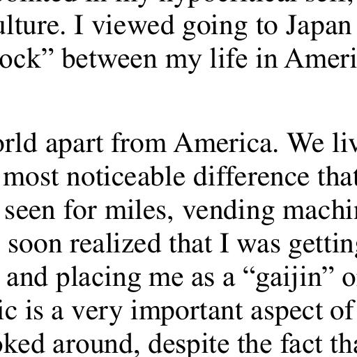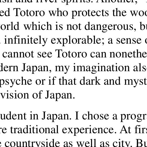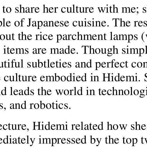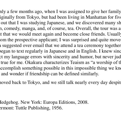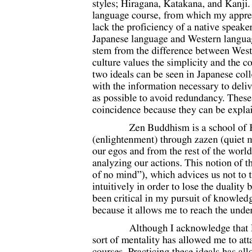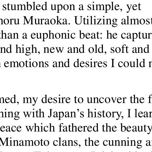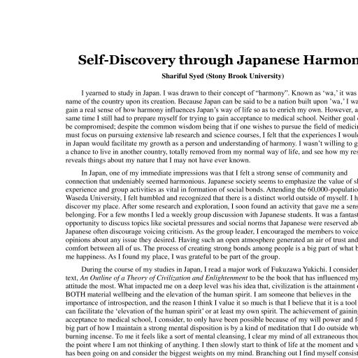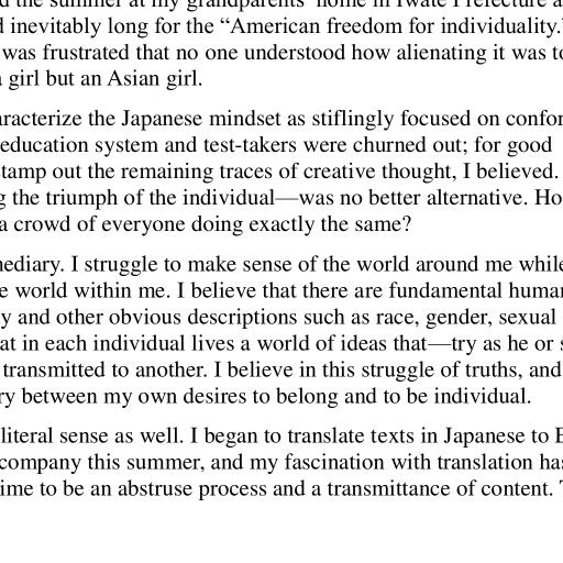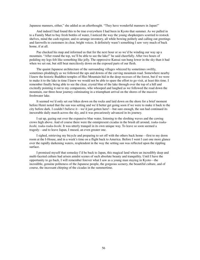 “Reflections on Japan”Hein Aung (Columbia University)“... it was as if he were watching a tableau in a dream — and that was no doubt the working of his strange mirror,” Kawabata Yasunari opens his most famous novel, Snow Country, with his protagonist peeping at a girl nursing — what he assumes to be — her sickly husband. Through his train car window, the protagonist, Shimamura, stares at the girl’s reflection. Despite the perverseness of a description of a man staring at a girl intently, for hours, Shimamura’s musings are not perverted. Offhand, one could take his actions as voyeuristic, but the pleasure he feels is not sexual, but, rather, sublime. The “unexplainable beauty” of the girl’s face superimposed onto the moving mountainous landscape compels his chest to rise. The narrator describes the mirror having “unreal, otherworldly power”. Shimamura seems to rejoice more in the unreal than the real. Hence, he is an expert in the art of Occidental dance, without ever having seen a single performance. Out of a dissatisfaction in the “old tradition,” Shimamura scours pictures, programs, and posters of the art. Oddly enough, Shimamura’s world vaguely resembles my perception of Japan — mirrored, yet inexplicably taking.