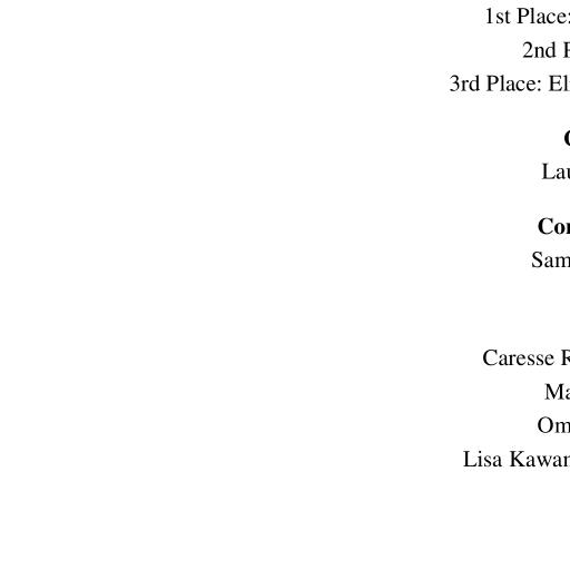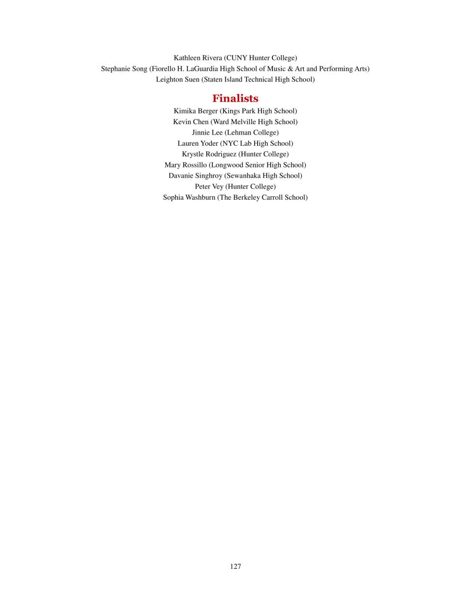 “Track: The Mental Game”Rachel Kitagawa (Syosset High School)“You have to run with your heart, not just for yourself, but for each other. When you feel like giving up, know that everyone else is facing the same pain, and they aren’t giving up.” I hear my coach say.