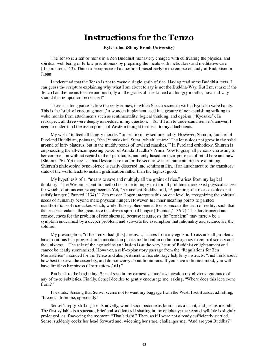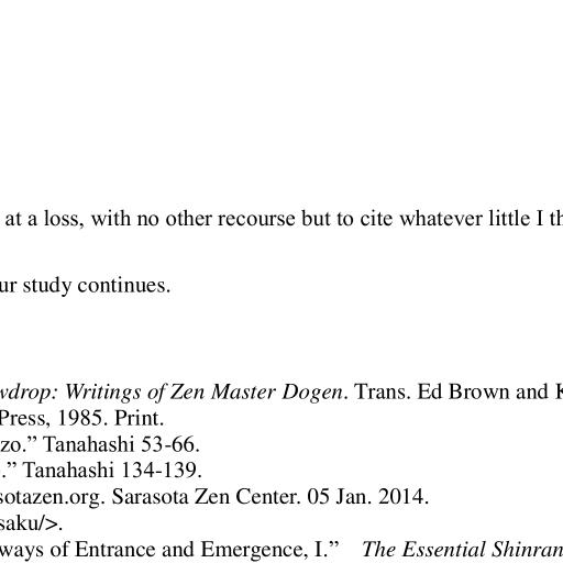 “Wrong.”Mohammed Ali (Stony Brook University)Dogen reached enlightenment when he witnessed his sensei beating another student with a slipper. I started sniggering when Sensei mentioned this, breaking the silence in our class. Everyone glanced at me and then looked back at Sensei, apparently not having the same image as I did of a very serious teacher beating a cowering and repentant student, and Dogen, instead of feeling the gravity of this scene, rushing off to burn incense in his room. I could almost see the lightbulb over his head and hear him exclaiming, “Eureka!” as he rushed off in the culturally confused corridors of my imagination. I bit my lip to control my laughter but another thought sobered me up effectively. For monks to come to Mount Hiei to study under a sensei and voluntarily subject themselves to a relationship where it was possible for them to be physically beaten as a normal course of action to study Buddhism, enlightenment must be serious business indeed. Students sat at the feet and mercy of their masters simply for the possibility of enlightenment.