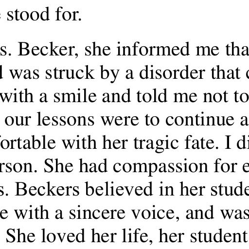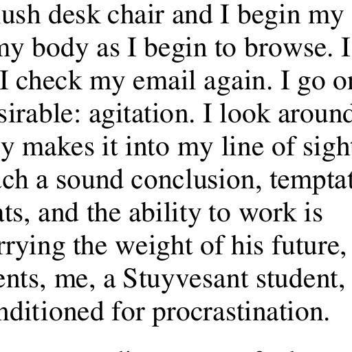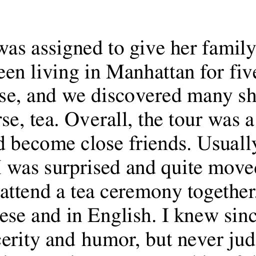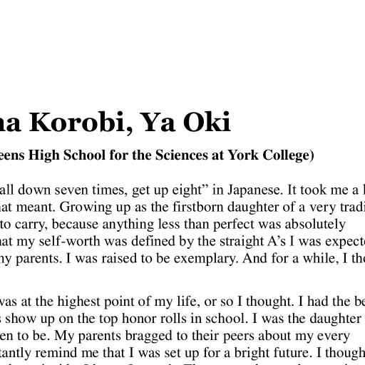 “A Remedy for Loneliness”Tia Culbreath (The Young Women’s Leadership School of Brooklyn)At a young age, I lost both of my parents. Of course, I was too young to fully understand what had happened to them, and why they stopped coming home after those fateful days. But a tiny, itty-bitty pit of loneliness began to form in me. I began to distance myself, making it harder to grow socially as I grew older. I didn't realize I was forming a barrier around myself, keeping people away when I needed them the most. That pit only grew more and more as I deserted my social needs and refused to socialize with other children. I lacked the tools I needed to express myself, to convey my feelings to the people around me. I was desperate for socialization, but allowed fear to keep my tongue still. No one could really understand me. In fact, I couldn't really understand myself at all.