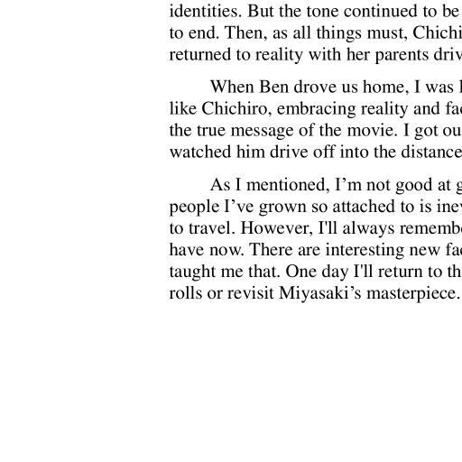 I begged for another episode. And another, and another. Soon, I was watching more than just Bleach- Sailor Moon, One Piece, Durarara, the movies produced by Hayao Miyazaki and Studio Ghibli. I threw myself into the animations, jumping from show to show. That empty, ugly pit inside me began to become filled- not completely, but enough that I began to feel a bit confident.