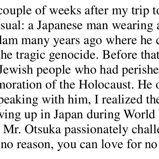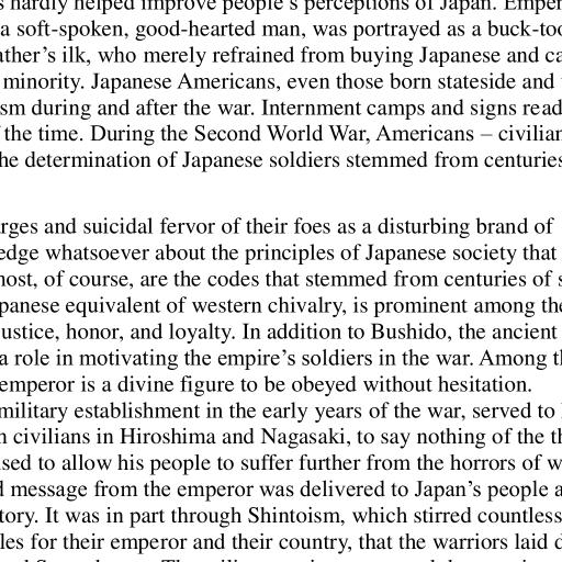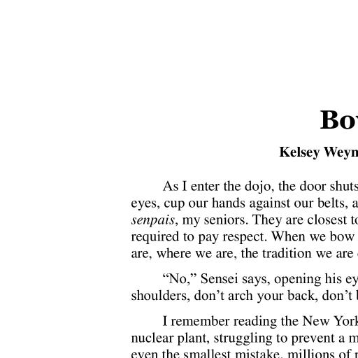 It was this story that came to me near the end of the semester when Sensei leaned forward, more animated than usual, and posed a question: if America were to launch a nuclear attack on Russia, destroying its entire population, should we feel responsible for the actions of our government? She asked us to raise our hands yes or no. For the first time in my life, I halfheartedly raised my hand between yes and no to give an opinion on a contentious topic. Yet I wasn’t undecided. I was curiously distant from the idea of making a decision, as though it was above my pay grade to be making decisions such as this.