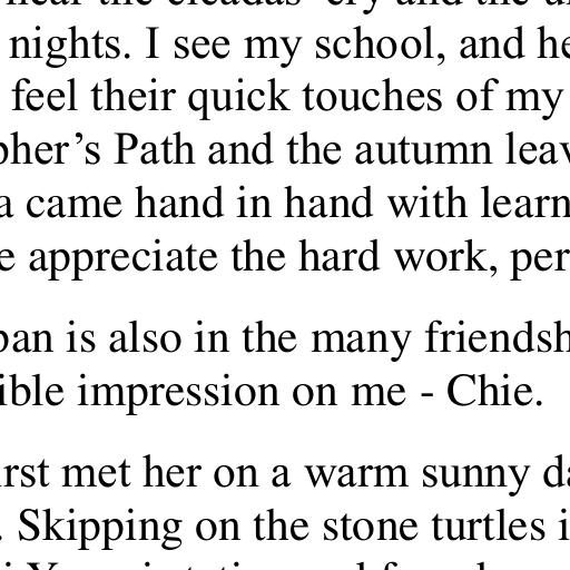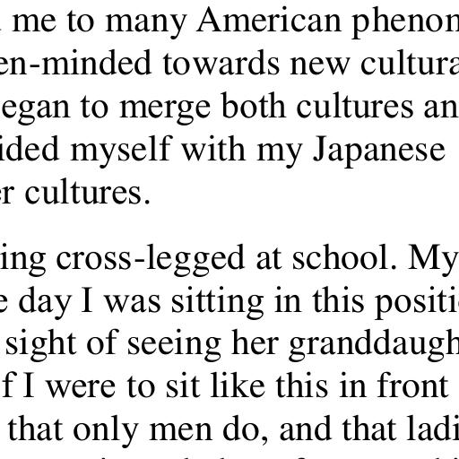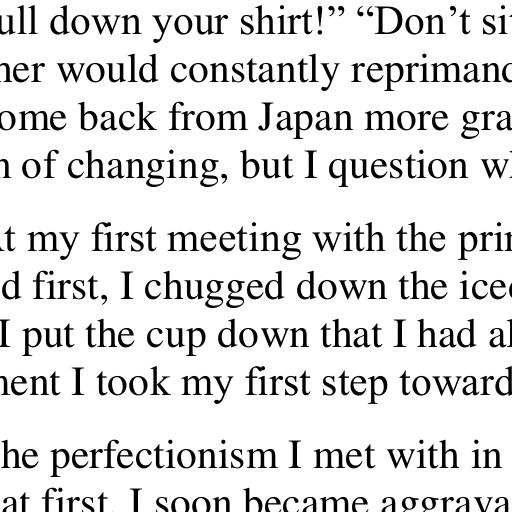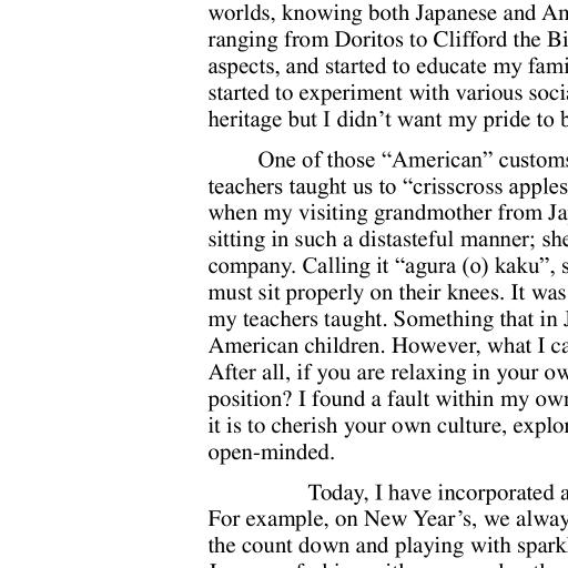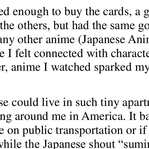 I slowly began talking to other people about my interest in Japanese animation. There were some who didn't understand my love at first, like my grandmother. And there were some who completely understood, like my brothers. Either way, just talking about it gave me the chance to open up, even if it was for just one conversation. A new me was beginning to form, like a pupa finally cracking open its shell. On my first day of middle school, I introduced myself to my peers, not with silence or just a quick statement of my name. “My name is Tia, and I like anime,” I said simply, praying there would be others who would understand and react. Thankfully, there were. I became a part of a group that could relate to each other, even with all of our differences. I began to talk about more than just my love for animation, finally breaking down the barrier that surrounded me.