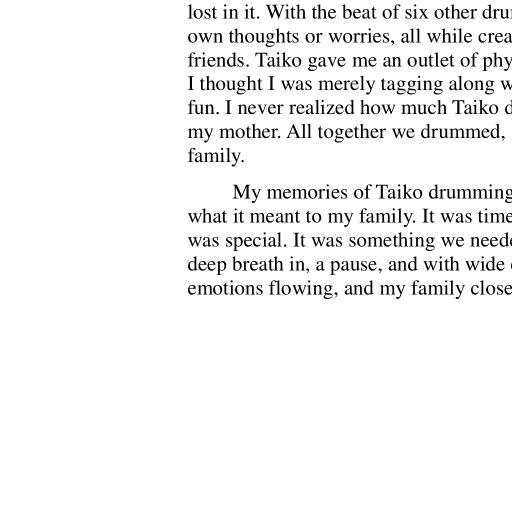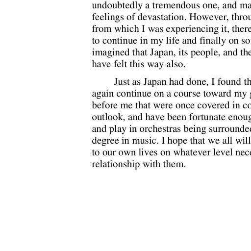 The music we learned and played throughout Japan taught me the power of spreading positivity, as loud as a wadaiko drum roar. I vowed to practice spreading love and virtue when I returned back to the states, and always in my life. At the end of the night, we left remarks in the shop owner’s guestbook. “Arigatou gozaimasu,” I wrote, showing my gratitude, hoping that peace could be returned to her life, as I finally, with new eyes, started to begin mine.
