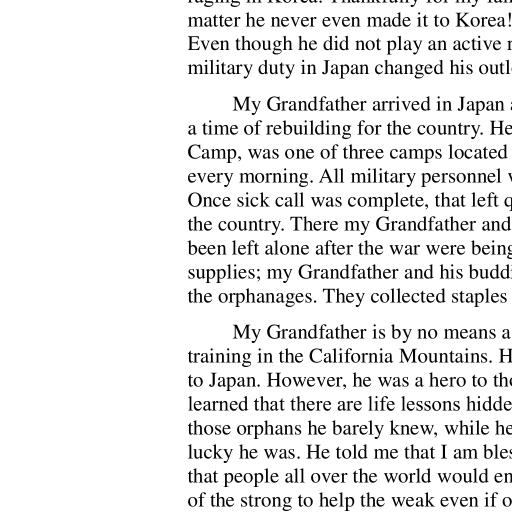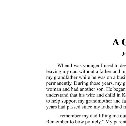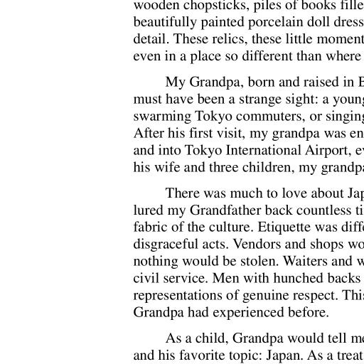 “A Buddhist Culture: Japan and the Monks”Kazuo Nakamura (Northfield Mount Hermon)I rested my head against the window as the train departed Tokyo Station. A temple, that is where I was going to be for the next eight days. My protests to my parents did not change anything, I had no choice but to go. Headed toward Kyoto, my long journey, reluctantly, began.