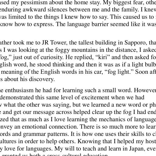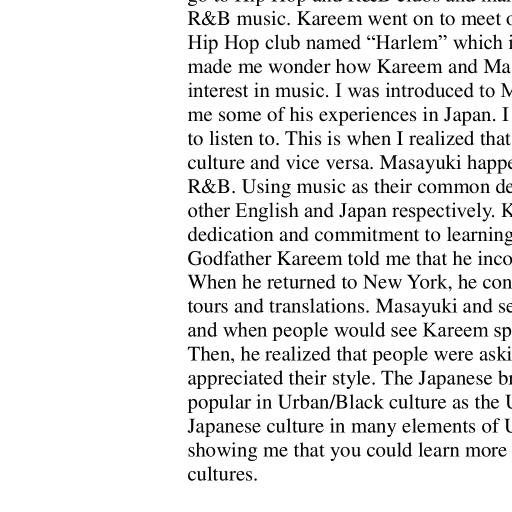 Growing up in West Harlem, I never imagined I would be experiencing the culture and community of Japan. I was not encouraged by my community or society to succeed in education. With my father absent from my life, and my mother unable to raise me herself due to how much she had to work to provide for us, being raised by my grandparents showed me the true meaning of appreciation. My mama and papa gave me all the warmth and care that I ever needed to believe in myself, and taught me to value education and my Dominican roots. Being under the wings of immigrants, I was able to synchronize my American identity with my Dominican heritage. This allowed me to have a deep empathy for my work in Japan, thanks to how they have nurtured me.