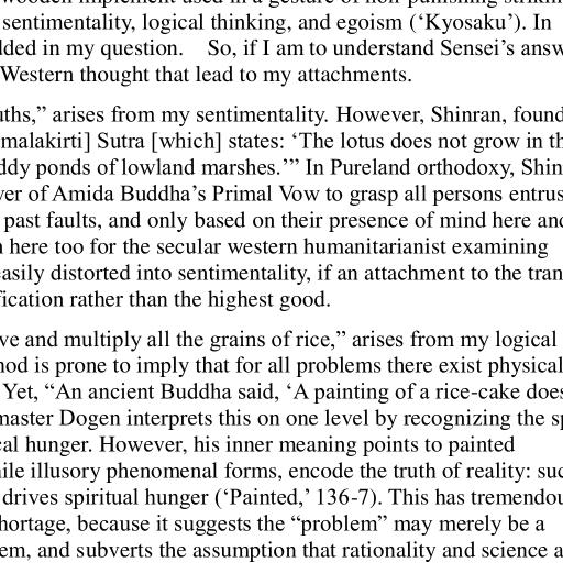 That it was a Japanese and Buddhist answer to the universal question: “What does it mean to be human?” was partly the point. People were too involved in their selfish egos to answer such a universal question. A culture that was rooted in urging people to transcend the ego, such as the tariki (other power) practices of Pure Land Buddhism, was the only way to gain the universal compassion to be able to understand and answer such an important question. Sensei stressed that understanding the concept of Jinen Honi in Pure Land was of chief importance. A seemingly circular concept, Jinen Honi stresses that Amida’s compassion, which allows you to get shinjin or true entrusting in Her, proceeds naturally to the person without them calculating to get it. Having shinjin allows you to truly invoke Amida Buddha (or perform nembutsu) and when you do, you become Amida Buddha, able to have true, universal compassion, unfettered by egoic attachments. But in order to be uncalculating, you must truly believe in your evilness, until you feel your helplessness enough to have complete trust in none but Amida Buddha. It cannot be a ploy directed to get shinjin.