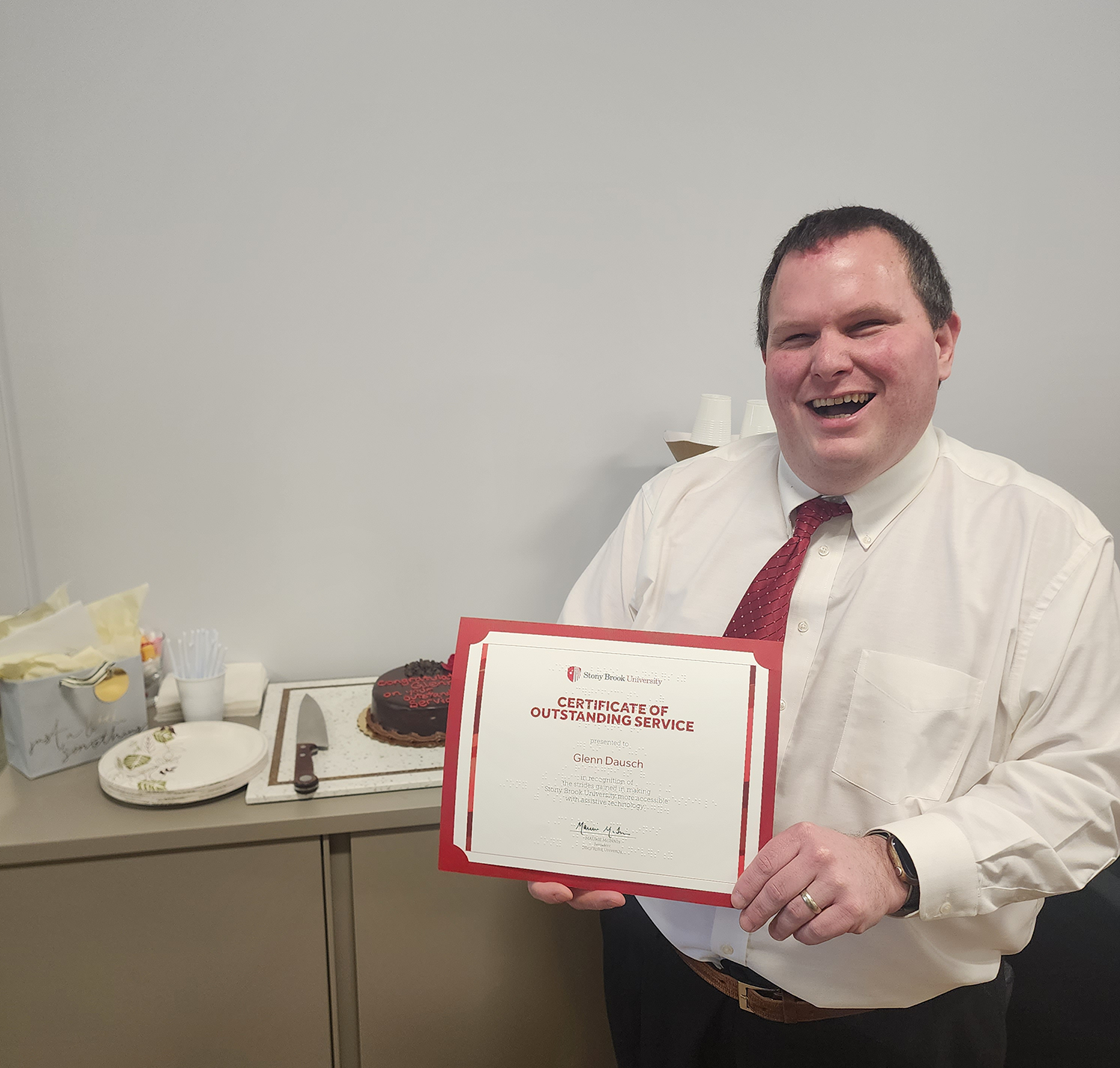 Recently OEA's Accessibility Officer and EIT Coordinator, Glenn Dausch, was recognized for Outstanding Service to the Stony Brook University Community by SBU's President, Maurie D. McInnis. Glenn has served the SBU community for 15 years to ensure equal access for individuals of all abilities and Stony Brook University's compliance with the Americans with Disabilities Act and other federal and state laws that ensure equal opportunity and access. |