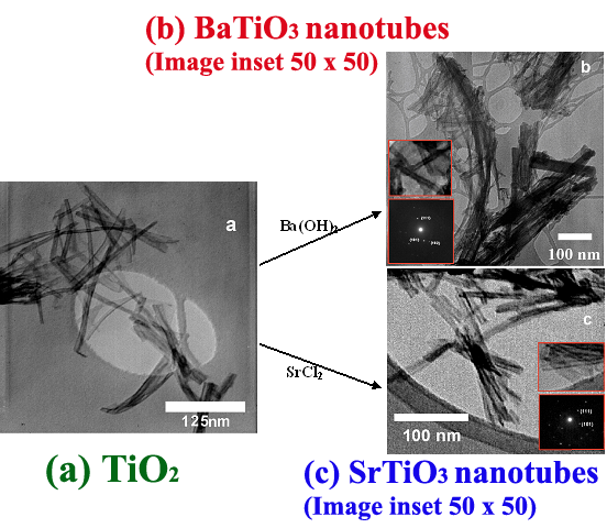 1. Mild, low-temperature, hydrothermal synthesis of BaTiO3 and SrTiO3 nanotubes using TiO2 nanotubes as templates. Outer diameter range of the BaTiO3 and SrTiO3 nanotubes produced was from 8-15 nm, inner diameter range was from 4-7 nm, and lengths varied from 50 to >500 nm.