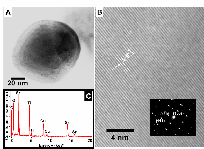 3. The ability to conveniently synthesize single-crystalline nanomaterials with controllable size and shape is essential for rationally exploiting their nanoscale physical and optical properties. A series of single-crystalline Ca1-xSrxTiO3 (0 ≤ x ≤ 1) perovskite nanoparticle samples of reproducible, tunable composition were prepared using a simple, readily scaleable solid-state reaction between metal oxalates and anatase TiO2 in the presence of NaCl and a nonionic surfactant. Shapes of the generated Ca1-xSrxTiO3 nanoparticles altered from cubes to quasi-spheres with decreasing ‘x’ values. Nanoparticles had sizes ranging between 70 and 110 nm, irrespective of Sr or Ca content.