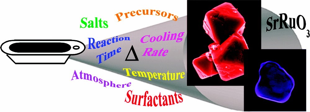 6. SrRuO3 (SRO) has been studied extensively at the bulk and thin film scales for a variety of applications, such as multilayer devices, field-effect devices, multiferroics, and even ferroelectric random access memory (FeRAM). Conversely, the exploration of SRO nanoscale and submicrometer scale structures in terms of both synthesis and applications has been significantly limited. Herein, we are the first to report on the synthesis of SRO submicrometer-sized particles via a molten-salt method. We have accomplished this by systematically probing experimental parameters such as precursors, type of salt, annealing time, annealing temperature, surfactant, cooling rate, and reaction atmosphere in an effort to predictably control the resulting size, shape, and morphology of the SRO product particles. In particular, by quenching the reaction at a cooling rate of 100 °C/min, we can produce rounded SRO particles averaging 149 ± 100 nm in size. Moreover, with the addition of a mixture of mineral oil in Triton X-100, the final SRO particles are highly faceted, single-crystalline octahedra, averaging 126 ± 45 nm in size. Apart from the choice of molten salt which primarily controls chemical composition of SRO, we have determined the most important experimental parameter for shape and aggregation control is the surfactant, because of a combination of its hydrophobic and hydrophilic characteristics. We have found that the decomposition of the surfactant promotes the formation of SrCO3, which is consistent with the generation of SRO through the reaction of SrCO3 with RuO2. Our successful syntheses have allowed us to explore physical properties, that is, magnetic and electronic, of these submicrometer-sized SRO particles, which are in good agreement with bulk SRO. Furthermore, we have also explored the potential of our as-synthesized particles as effective methanol oxidation reaction (MOR) catalysts for direct methanol fuel cells (DMFCs). Not only are our as-synthesized SRO particles MOR active but also our well-defined faceted octahedra exhibit a 4-fold increase in mass-activity and a 4-fold increase in surface area by comparison with the rounded particles, thereby emphasizing a clear advantage of faceted submicrometer SRO for electrochemical applications.